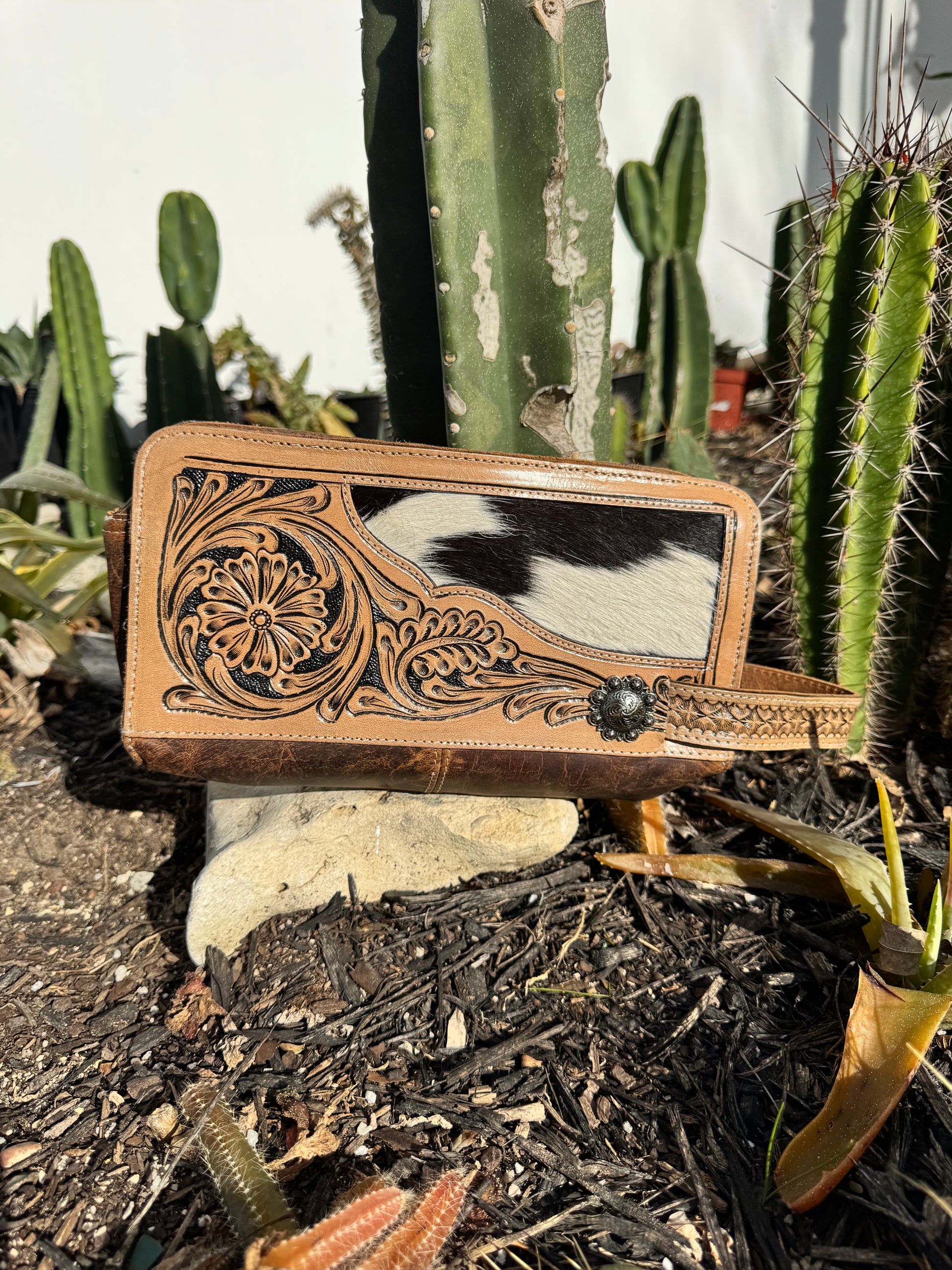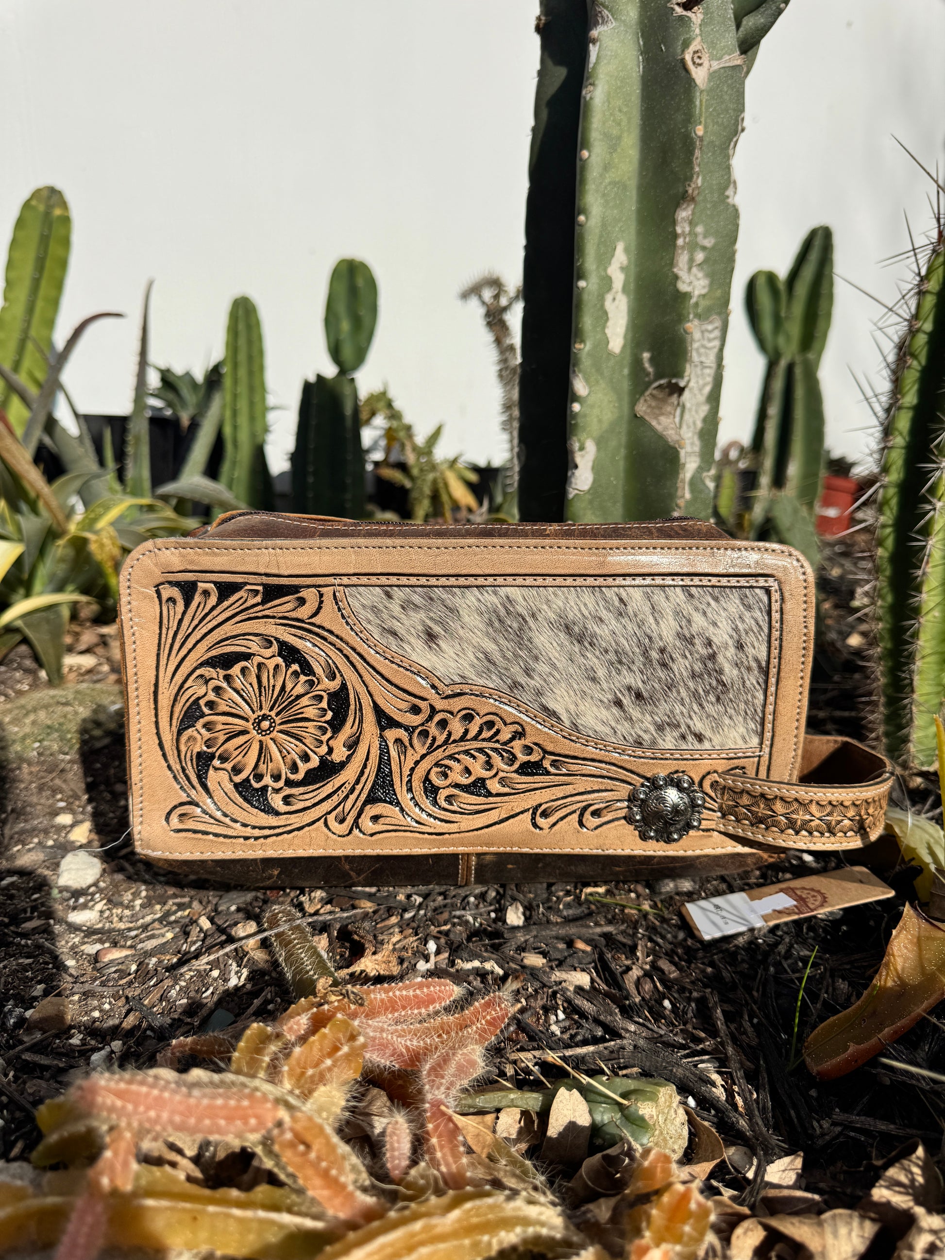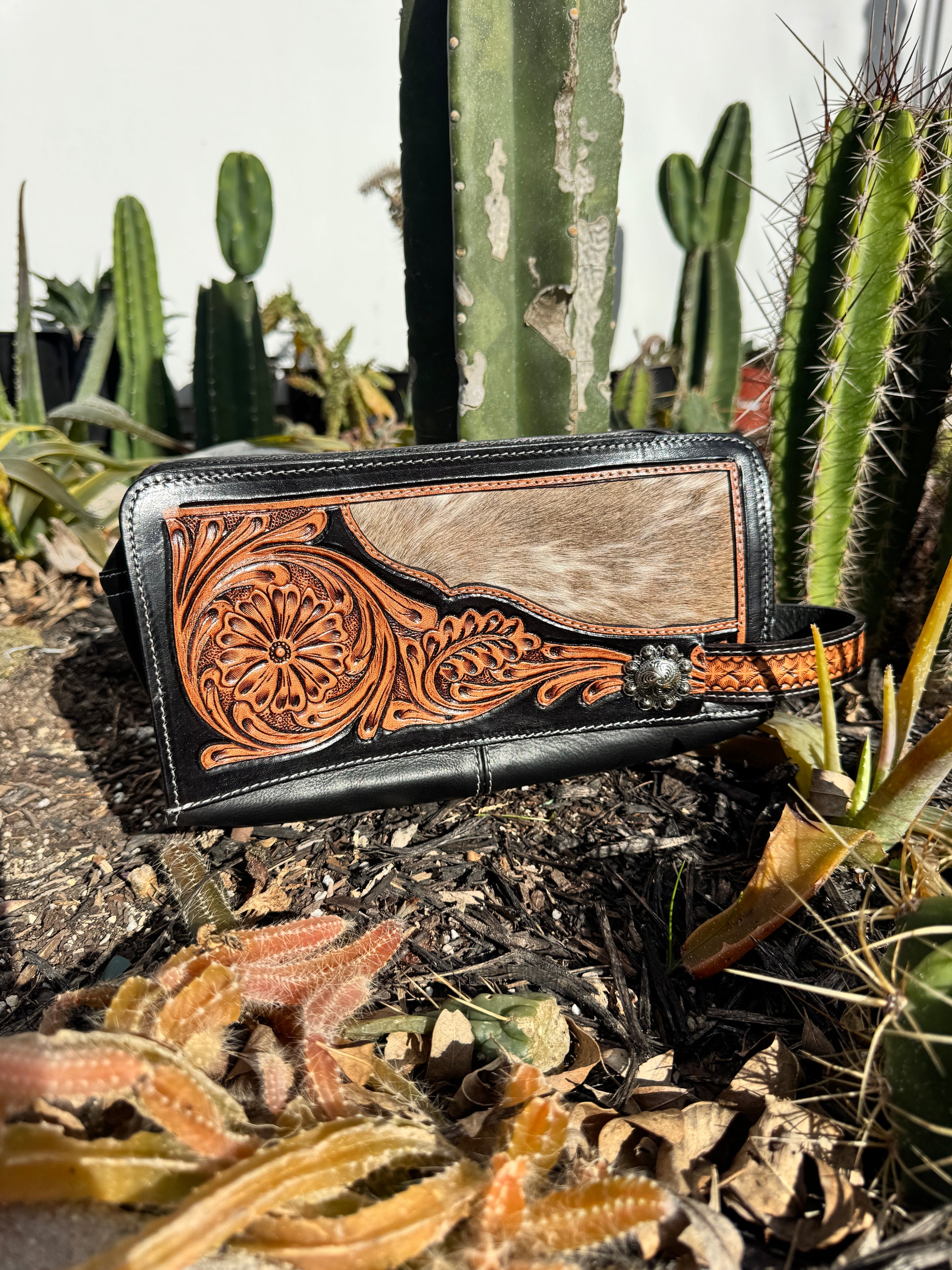 The Leather Tooled Toiletry Bag is crafted from premium leather and cowhide, ensuring durability and a refined aesthetic. Its spacious interior provides ample storage for travel essentials, while the sturdy handle enhances portability. This bag combines functionality with quality materials, making it a practical choice for organized travel.